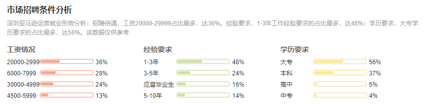 以深圳为例,亚马逊运营人员招聘薪资占比最多的在20000-29999这样一个范围,多达36%,足以表明行业对于运营高端人才的极度渴求;公司要求拥有经验1-3年的几乎占了深圳在该行业招聘的一半;大专学历要求达56%。