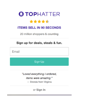 Tophatter = 真正的娱乐:把Tophatter 想象成一个快速购物的游戏,90秒竞拍为买家营造了刺激的气氛,带来了购物的紧迫感。