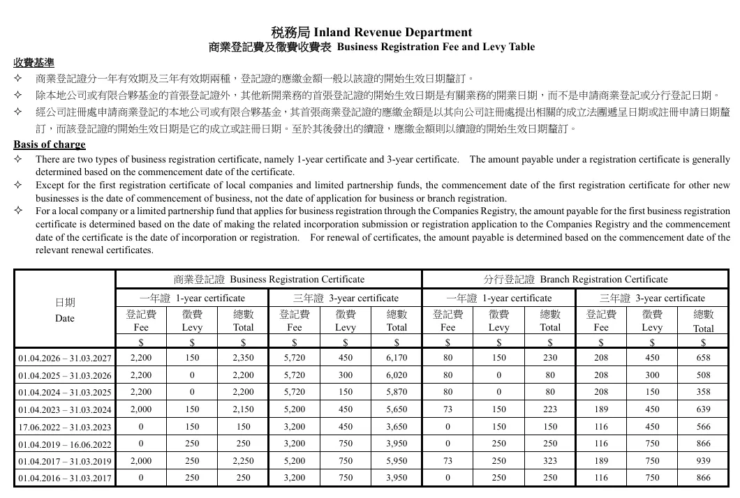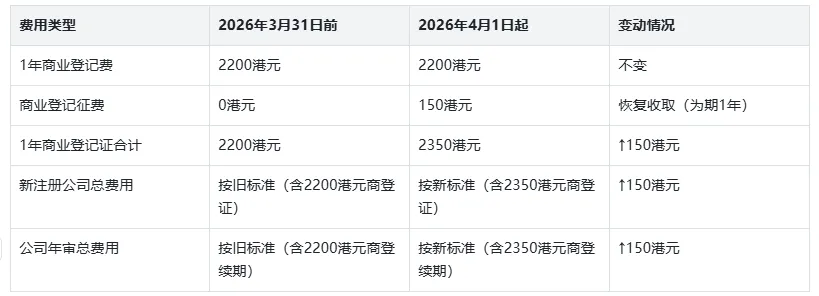 根据香港政府2026/27年度财政预算案及税务局、公司注册处最新公告,自2026年4月1日起,香港公司商业登记相关费用调整,新注册、年审费用同步上调150港元。