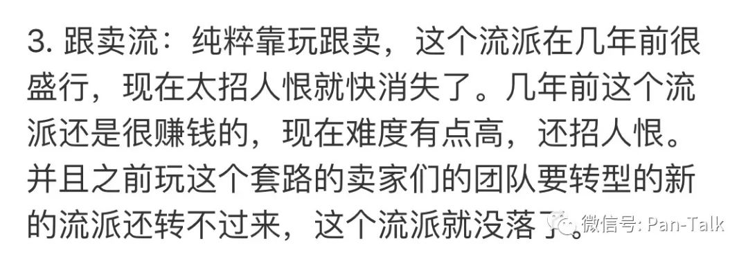 几年前,跟卖非常流行。2014年底,华南某跨境电商初创社群去义乌打江山的时候,社群的主要创始人就被宣传为“跟卖小王子”,随着该社群的影响力越来越大,带动了义乌一大批eBay、速卖通的卖家转投亚马逊走向跟卖的道路,最后有些人一飞冲天了,更多的人是陷入泥潭越陷越深,还有的人则彻夜不眠,盯着爆款一顿猛跟,最终精疲力竭,差点把自己的命也跟没了。难怪某微博大V归纳如下: