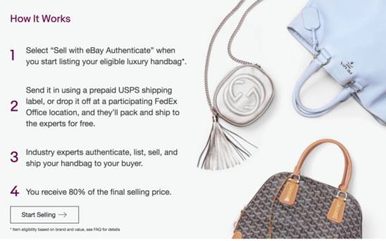 eBay推出了一个称为eBay Authenticate(eBay鉴定)的新项目,允许卖家选择是否对他们在线售卖的奢侈品进行鉴定。最初,该服务将集中在包括路易威登、香奈儿,爱马仕,古驰,普拉达、巴宝莉,迪奥,芬迪,巴黎世家,Goyard,Celine和Valentino等12个高端品牌的豪华手提包和钱包上。