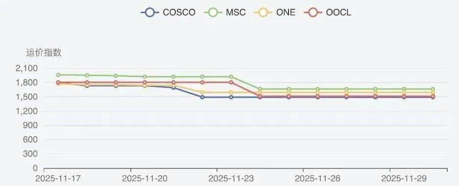 欧洲航线即期市场订舱价格出现回落。11月21日,上海港出口至欧洲基本港市场运价(海运及海运附加费)为1367美元/TEU,较上期下跌3.5%。
