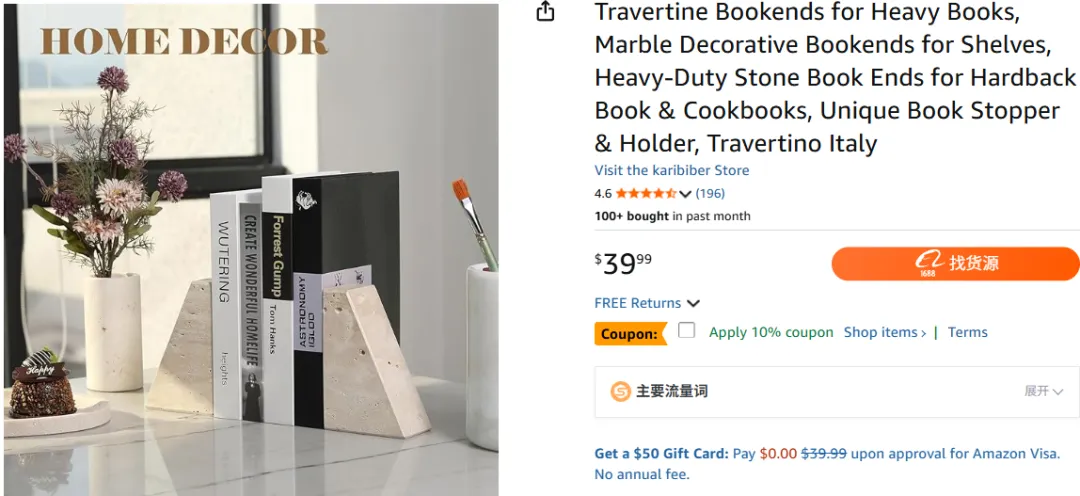 核心成交词:Travertine Bookends(精准材质词,自带溢价)、Marble Bookends for Shelves、Heavy Duty Bookends.