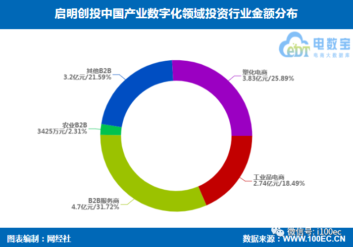 行业金额分布上,塑化电商3.83亿元、其他B2B3.2亿元、农业B2B3425万元、B2B服务商4.7亿元、工业品电商2.74亿元。