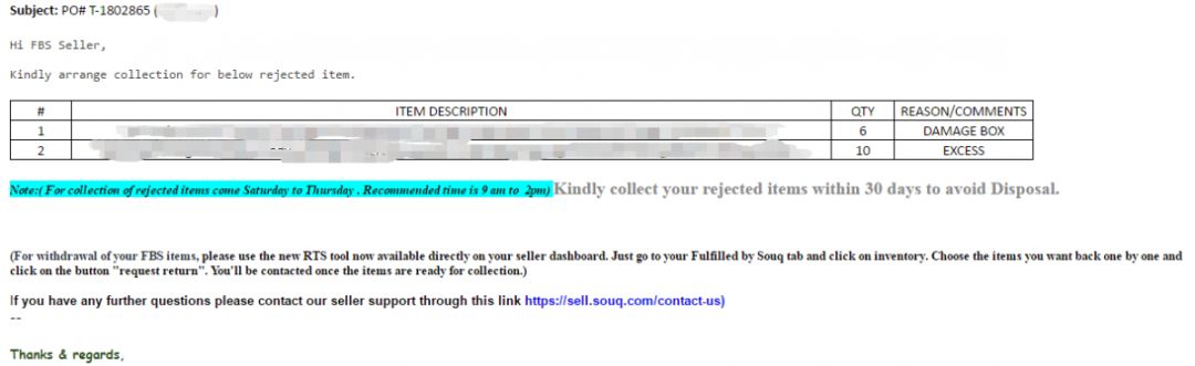 12月31日前,如未收到正式的退仓邮件,可与fbs.stock.management@souq.com取得联系,索要退仓明细,退仓明细模板如下: