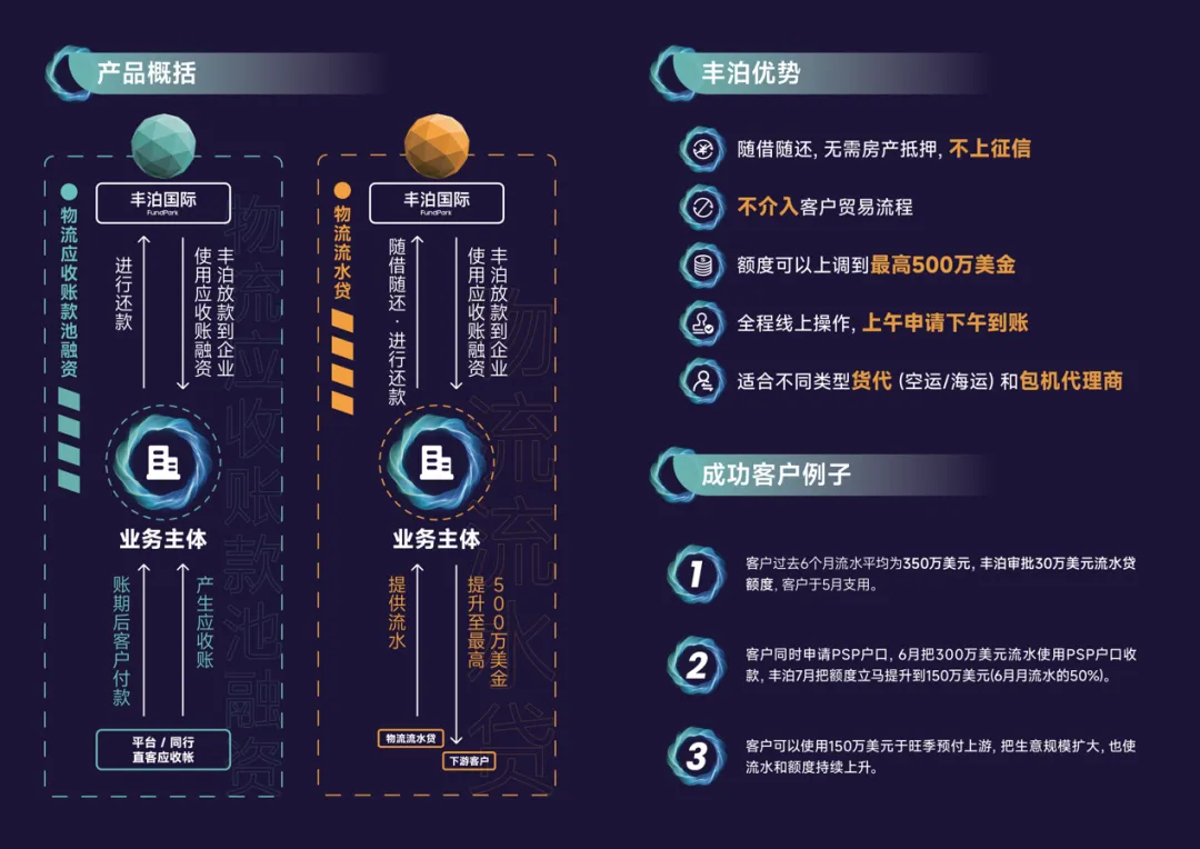 无需房产抵押、不介入贸易链条:无需房产抵押,随借随还,不上征信。丰泊只做资金的“加油站”,不做业务的“干预者”。
