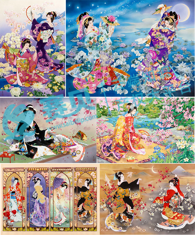 Haruyo Morita是一位有特色的艺术家,专画两类题材:一是身着和服的女性,二是充满诗意的田园景致。她的作品风格独特,是对传统浮世绘的当代诠释,涵盖了从平安时代到江户、明治时期的艺术元素。