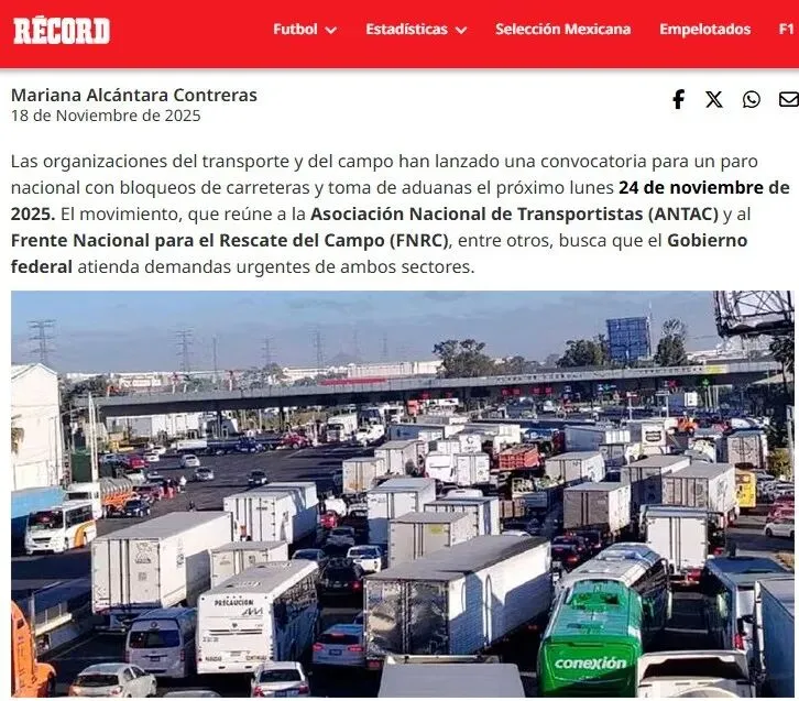 据外媒消息,墨西哥将于11月24日爆发全国性罢工。由墨西哥全国运输协会(ANTAC)和墨西哥农民农业运动(MAC)组织,运输工人和农民将参与抗议活动。
