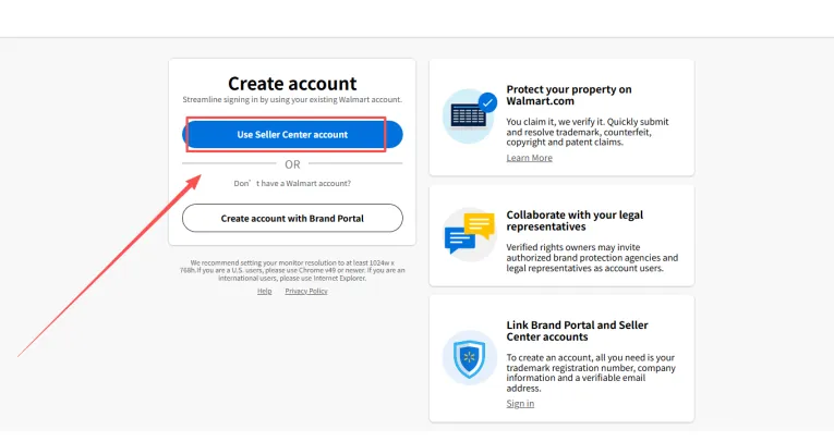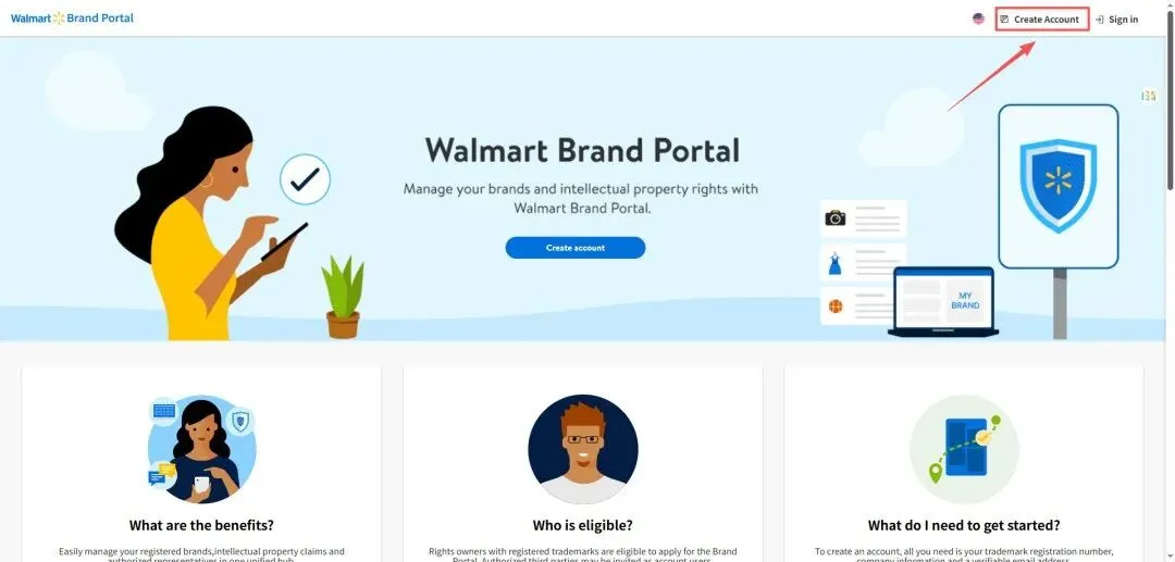 请登录https://brandportal.walmart.com/,进入品牌门户网站,然后选择“create account”(创建账号)。