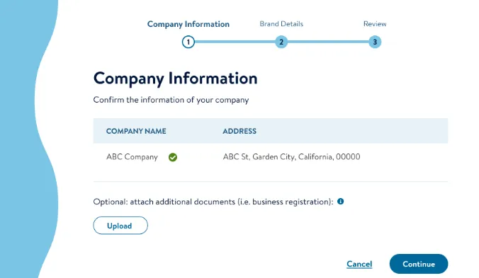 这一步是验证您公司的详细资料,Company Information页面会自动填充跟卖家后台一样的公司信息,您也可以上传相关文件(不强制要求),相关文件包括企业注册文件、企业收购文件或任何能证实您提供的地址与注册公司相符的文件。确保信息正确无误后点击Continue (继续) ,进入Brand Information (品牌信息)部分;