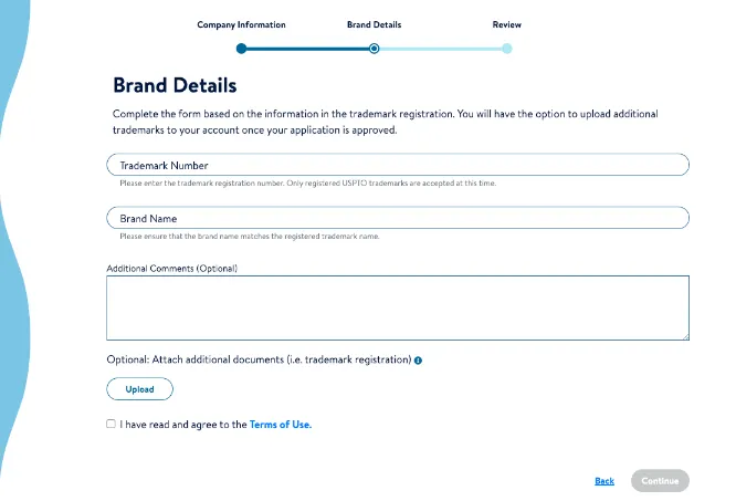 需要输入品牌详细信息,包括填写品牌的USPTO注册号和品牌名称,并上传USPTO文件。您可以选择输入注释来解释您的证明文件,完成该步骤后,请选择"I have read and agree tothe Terms of Use (我已阅读并同意使用条款) "旁边的复选框,然后点击Continue (继续);
