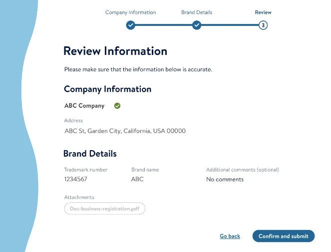 检查公司和品牌信息,确保所有信息正确无误。若发现错误,请选择Back(返回)以回到之前的页面并更正错误。确保所有信息正确无误(包括上传的附件)后,点击Confirmand Submit (确认并提交即可);