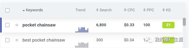 1,pocket chainsaw,关键词月均搜索量是6800,seo难度是21,用的工具是kwfinder查询的。