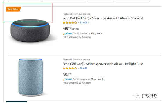 例如,对于特定类别的产品搜索“音箱”,您将得到一个产品结果列表,其中一些结果将在产品列表的左侧角落有这样的一个小标志。