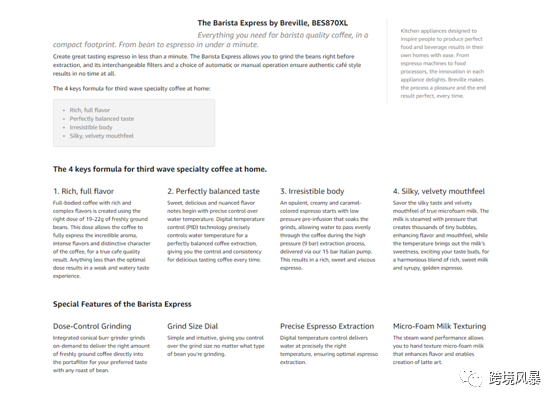 如果你想看到一个真正诱人的产品描述,看看这家DeLhongi意式咖啡机吧,这是“espresso maker(意式咖啡机)”一词搜索排名最高的一个产品。
