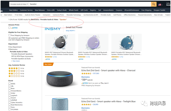 不知道卖家有没有注意到这点,亚马逊的搜索结果是按照品类范围显示,比如搜索Speaker,会出现下图红圈所示: