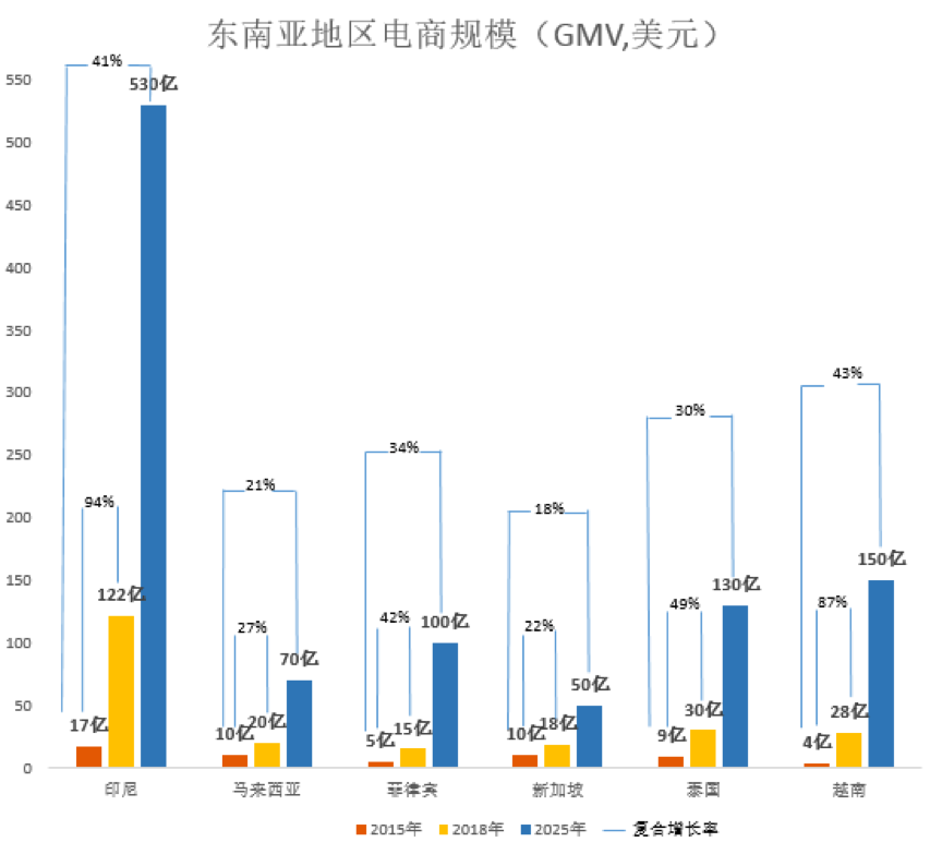 1)东南亚地区网络使用人口增长与电商规模增长并肩前进。根据Google TEMASEK 2018年东南亚e-Conomy报告显示:2018年,东南亚地区互联网用户达到3.5亿人,比2015年的2.6亿增加了9000万。同时也提到,东南亚地区电商规模在2015年仅55亿美元,而到2018年,东南亚电子商务市场规模高达233亿美元。