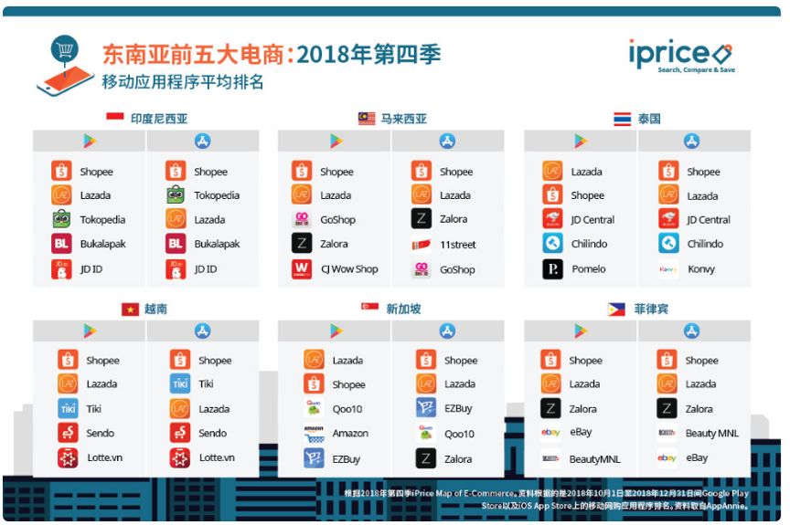 由iPrice Group2018年第四季度iPrice Map of E-Commerce资料显示:Lazada和Shopee是东南亚地区最受欢迎的电商平台,几乎覆盖了东南亚地区所有国家下载排行榜的第一位。