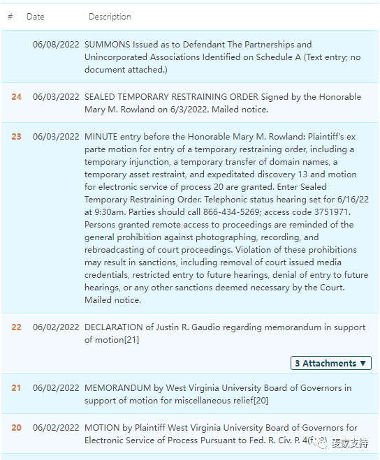 上月GBC连发几案为代理的大学维权,除了密歇根州立大学、路易斯安那州立大学、俄克拉荷马大学,月底西弗吉尼亚大学也委托GBC律所进行了首次维权。截至目前,法院临时限制令(TRO)已下发,部分卖家账户资金已被冻结!更多案件详细信息及最新进展,可关注《麦家支持》公众号,进入专属案件查询系统。