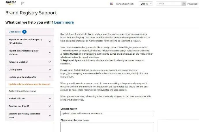 然后就进入了Brand registry support 开 case 界面