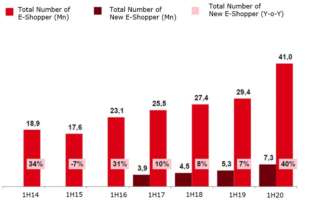新冠肺炎疫情爆发后电子商务用户急增。资料来源:Ebit、尼尔森(Nielsen)
