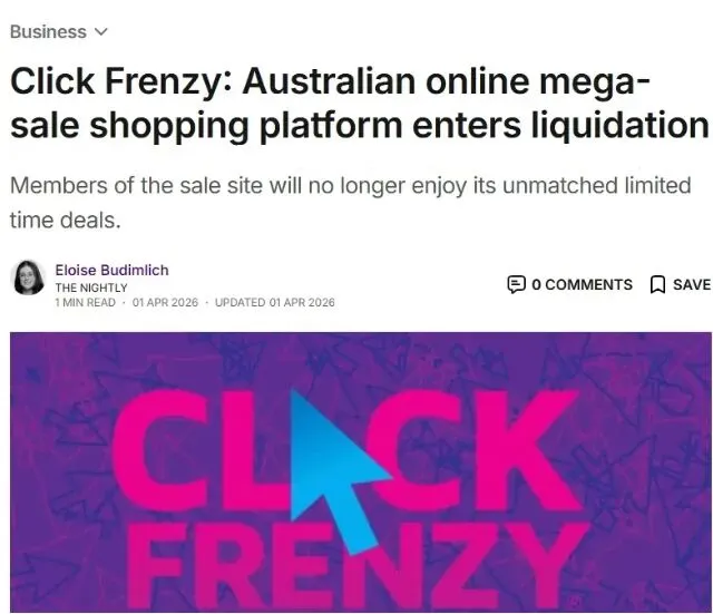 2026 年 3 月 30 日,澳洲标志性电商促销平台Click Frenzy正式宣布自愿清算,网站随即停止访问,成为近期又一家轰然倒下的本土电商平台。