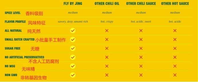Fly By Jing官网上一直挂着与其他辣酱制作成分的对比图。
