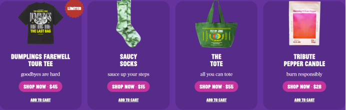 Fly By Jing从只售卖辣椒酱到售卖饺子、包子、火锅底料再到现在售卖T恤、袜子、背包、贺卡等周边物品。