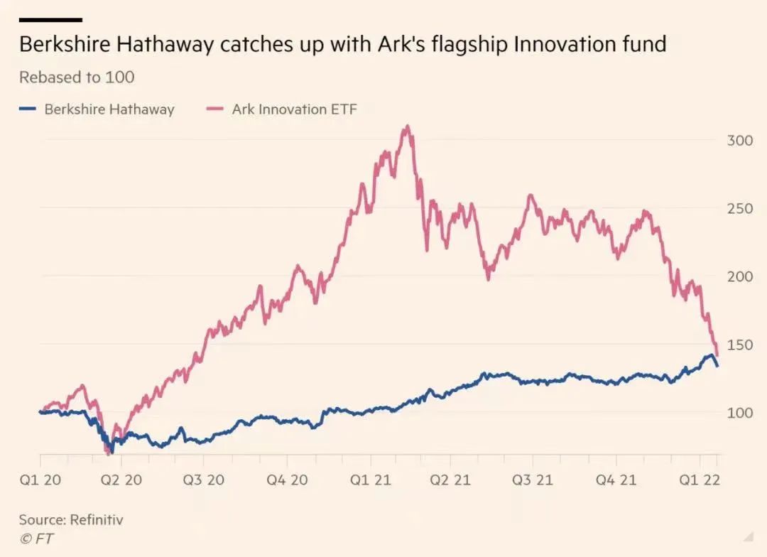 前晚看到了一篇文章复制了一个片段分享一下:这图里的红线是最近几年美股女股神“木头姐”管理的基金净值,而蓝线就是老头的伯克希尔的净值走势。