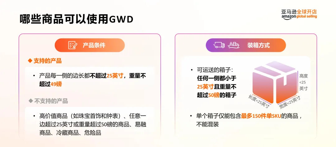 目前GWD深圳仓对商品的尺寸重量、品类和装箱方式也给出了一定限制(获取《亚马逊全球智能枢纽仓产品介绍》,可添加侃侃客服微信:kjwewe)。此外,在将货物运至GWD的前端环节,卖家需要使用整车运输,并通过散箱或托盘形式入仓,GWD目前暂不支持通过小包裹运输入库。