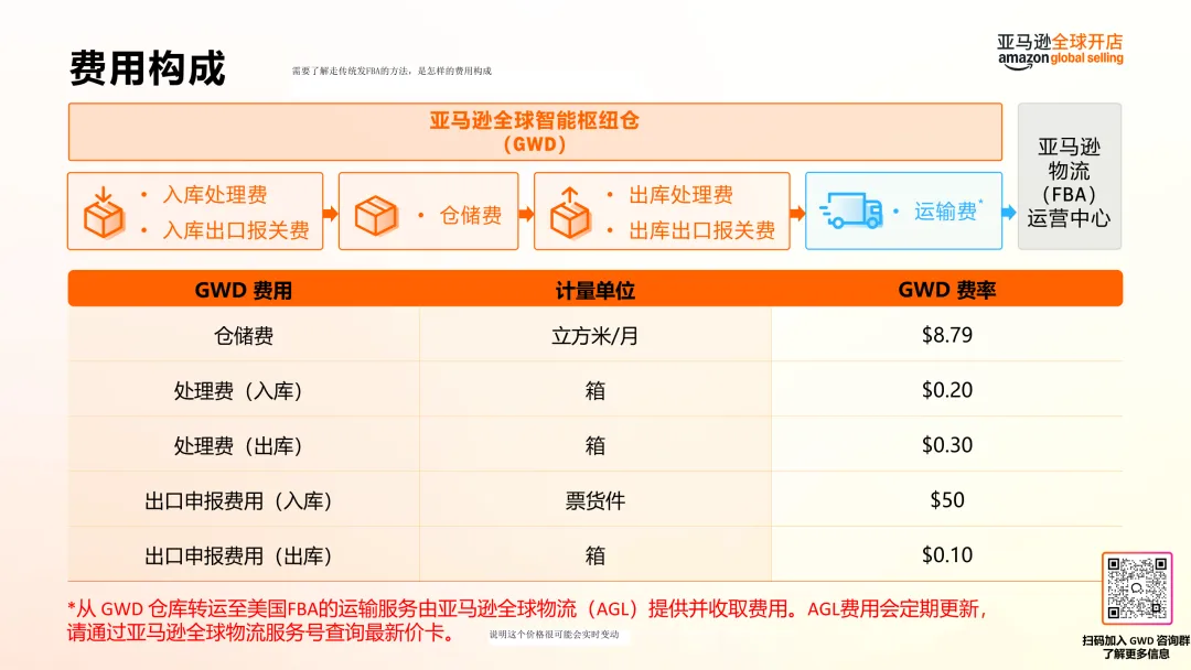 根据官方资料,GWD的费用由“入库处理费/入库出口报关费+仓储费+出库处理费/出库出口报关费+运输费”组成,具体的费率标准如下图所示: