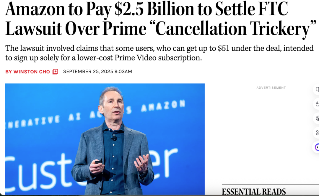 和解要求:15亿美元用于消费者补偿(单人最高51美元),其余作为罚金;购物页面需明确显示订阅提示,禁止误导性按钮。亚马逊表示将继续优化订阅与取消流程,以便用户操作更清晰、透明。FTC强调,该案体现了对平台“暗黑模式”的持续执法关注,推动信息展示透明化。