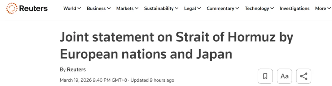 最新报道称:当地时间3月19日,英国、法国、德国、意大利、荷兰及日本就中东局势发布联合声明,表示将准备参与相关护航行动,确保霍尔木兹海峡( Strait of Hormuz )航行安全,并采取措施稳定全球能源市场。