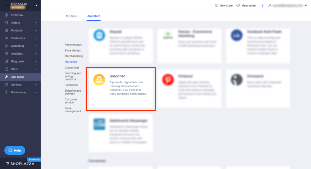 在 店匠SHOPLAZZA 后台应用市场中,有专门为 Snapchat 定制的广告数据追踪插件,支持商家通过绑定对应的 Pixel ID 追踪 Snapchat 的广告数据,帮助投放 Snapchat 的商家更好地查看广告投放效果。