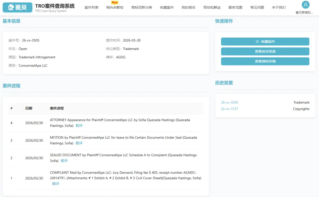 从赛贝TRO案件查询系统获悉,原告为美国知名游戏开发公司ConcernedApe LLC,由AGDG律所代理,诉讼类型为商标侵权和版权侵权,涉案产品涵盖游戏软件及周边、服饰、玩具、娱乐服务相关商品等,涉及电脑游戏软件、T恤、毛绒玩具、游戏设备等多个细分类目。跨境卖家需立即排查店铺内使用该商标及相关版权元素的产品