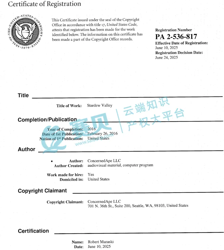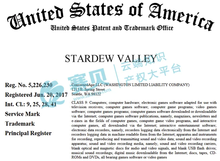 ConcernedApe LLC是一家总部位于美国华盛顿州西雅图的独立视频游戏开发公司,核心代表作是热门农场生活模拟游戏《Stardew Valley》(星露谷物语)。该游戏自2016年2月26日首次发布以来,迅速风靡全球,截至2024年12月,销量已超过4100万份。玩家继承了一座破败的农场,并通过种植、养殖、采矿、社交等玩法努力将其重建。本案为商标+版权双重维权,由于具体版权图片未公开,使用游戏相关角色形象等均有侵权风险!