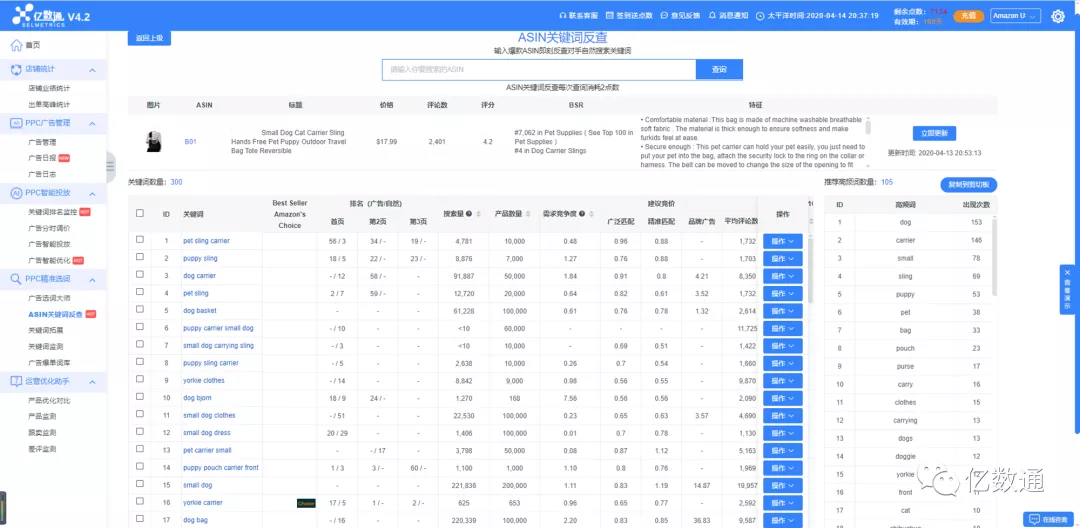 借助亿数通系统的[关键词反查功能],卖家可以一站式获取亚马逊上任一Asin的收录词、对应收录词排名Top10的产品,此外还能看到查询Asin位于前三页的自然搜索和广告排名,建议竞价与产品竞争数据。