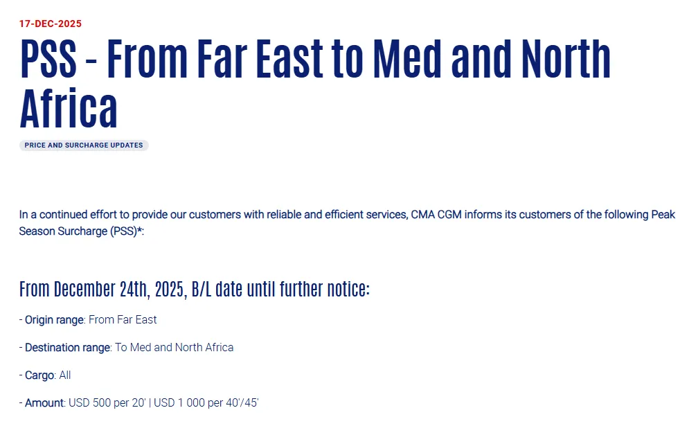 12月17日,达飞宣布为持续向客户提供可靠高效的服务,自2025年12月24日起,直至另行通知,从远东至地中海和北非的所有货物将征收旺季附加费(PSS), 20'集装箱征收500美元,40'和45'集装箱征收1000美元。