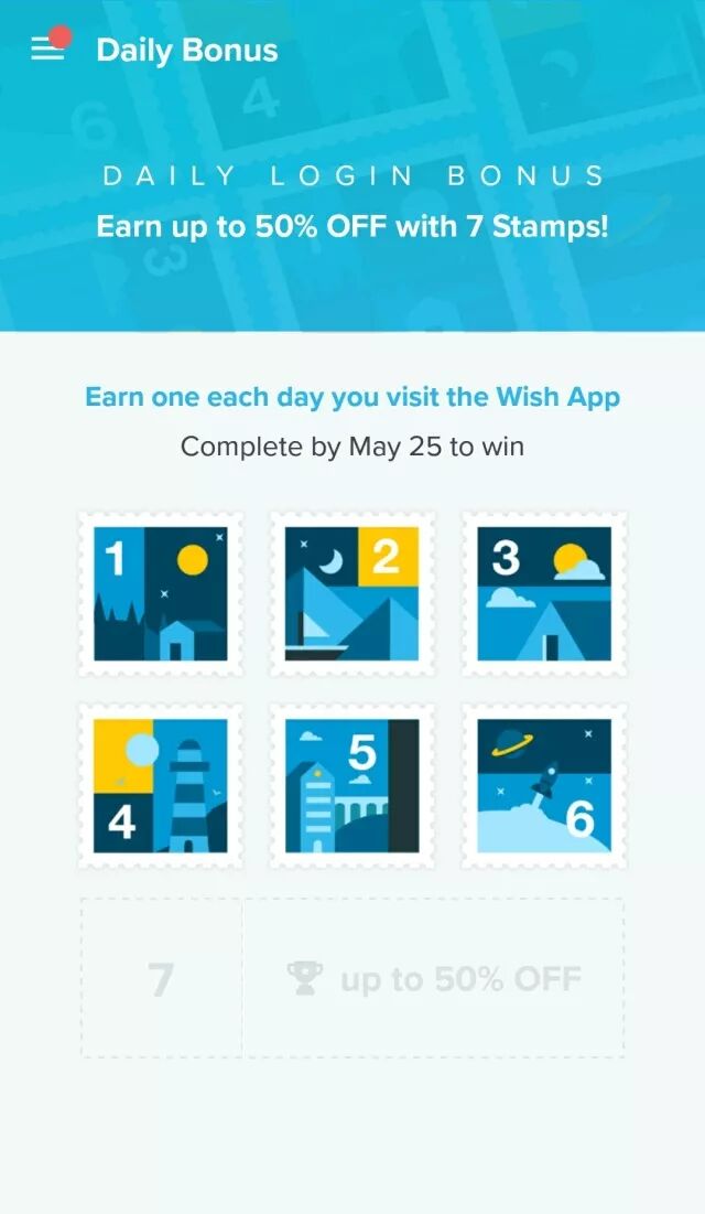 Wish最近又发起了新的促销小游戏——集邮,用户每天登录Wish客户端,都可以领取一张邮票,集齐7张邮票后就有机会获得高达5折的购物优惠!为了激发用户购买,Wish也是很拼哒~