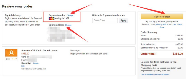 4–选择你自己的付款卡(建行 中行的卡),最后买单完成,完成后一般几分钟–几小时内,银行扣款完成后,电子礼品卡的code就会发送到你上面填写的邮箱了。
