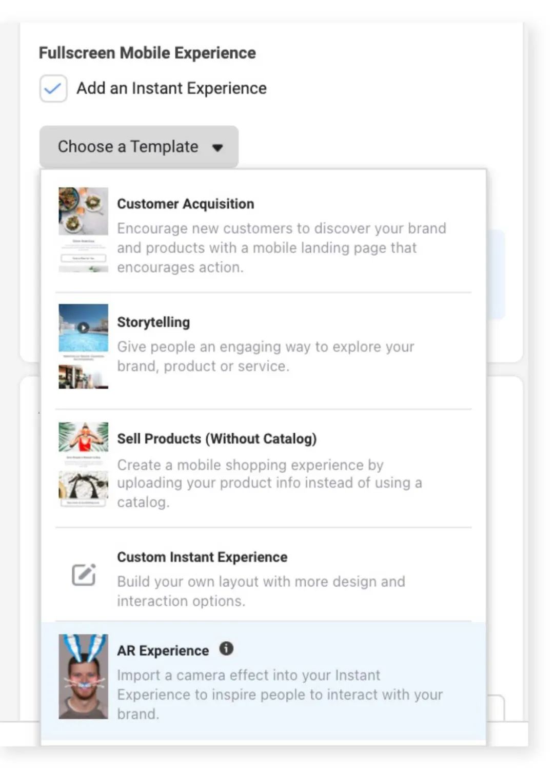 前往广告管理工具。 轻触绿色的 + 创建按钮。 选择以下 AR 广告适用的广告目标:品牌知名度、流量、转化量(仅限 Facebook)、覆盖人数 输入广告系列与广告组的所有必要信息和设置。 在广告层级,选择添加即时体验。 轻触选择模板,然后选择 AR 体验模板。随即将显示新弹窗。