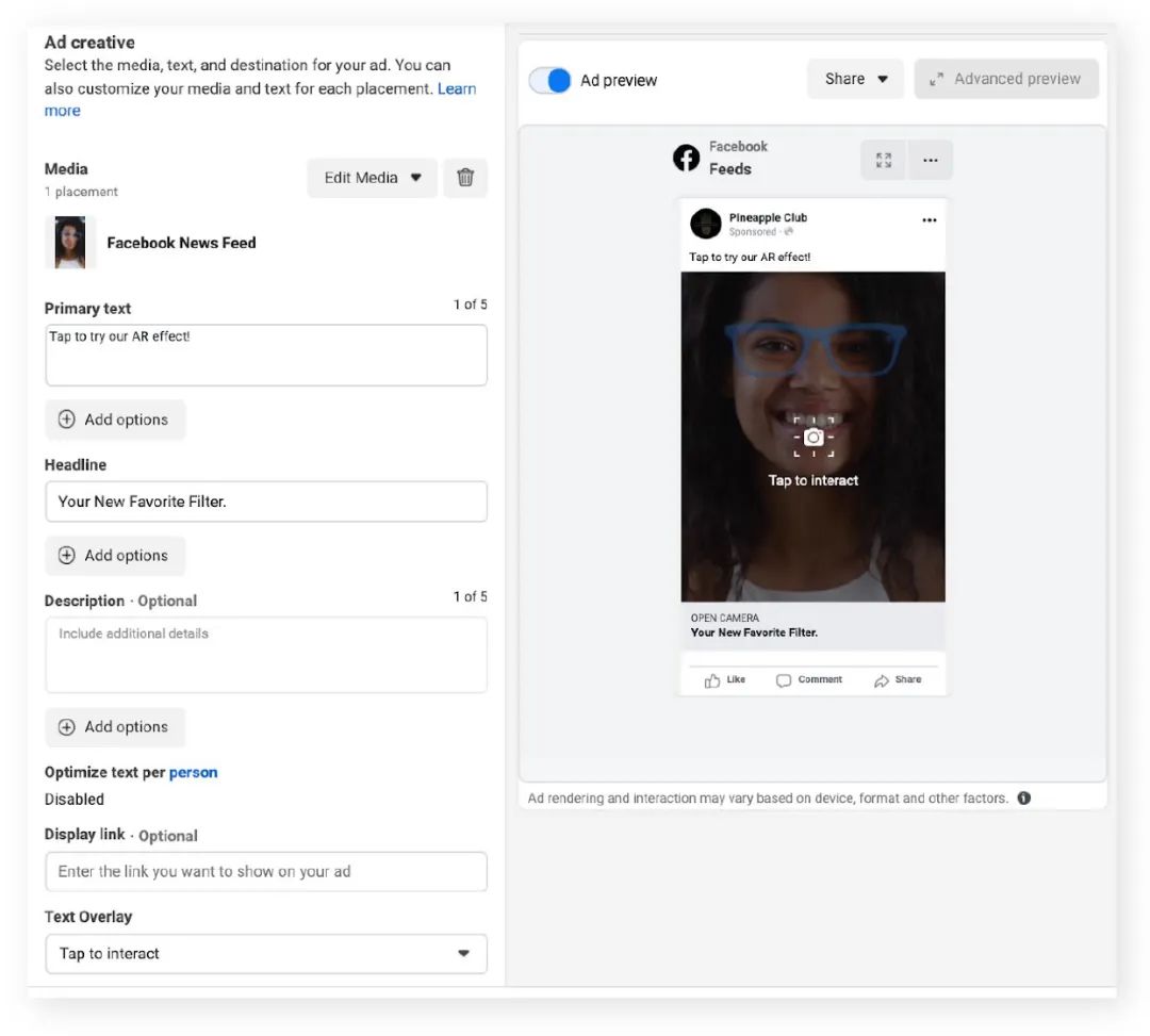轻触完成。 在“广告创意”版块,点击添加视频。选择想要用于广告的视频,然后轻触下一步。对广告创意加以调整(如适用),然后轻触完成。AR 广告必须采用视频素材。 为视频广告 (Video Ad) 输入正文和标题。 将“显示链接”留空,以便在广告上显示“打开相机”标签。 在“叠加文字”下,根据您希望用户在看过视频后采取的操作选择行动号召。 要预览完整的 AR 广告,轻触右上角的三点图标,然后选择发送通知到 Facebook。我们将向您移动设备上的 Facebook 应用发送通知。