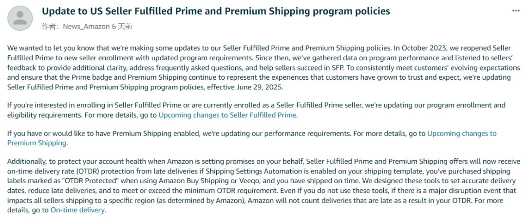 允许每月发货量未达100件的卖家继续参与计划(但会限制订单限额); 调整准时送达率保护机制,优质配送的最低OTDR要求将从97%下调到93.5%
