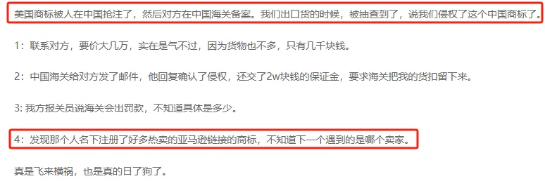 备案后,卖家的货物一旦遇到海关查验,就会被判侵权并扣留货物。若想要让货物顺利出口,则需要拿到商标持有人的授权。抢注者就会趁此机会狮子大开口,大几万、10几万甚至是28万……若不妥协交钱,卖家将面临海关罚款、货物销毁等惨痛后果。