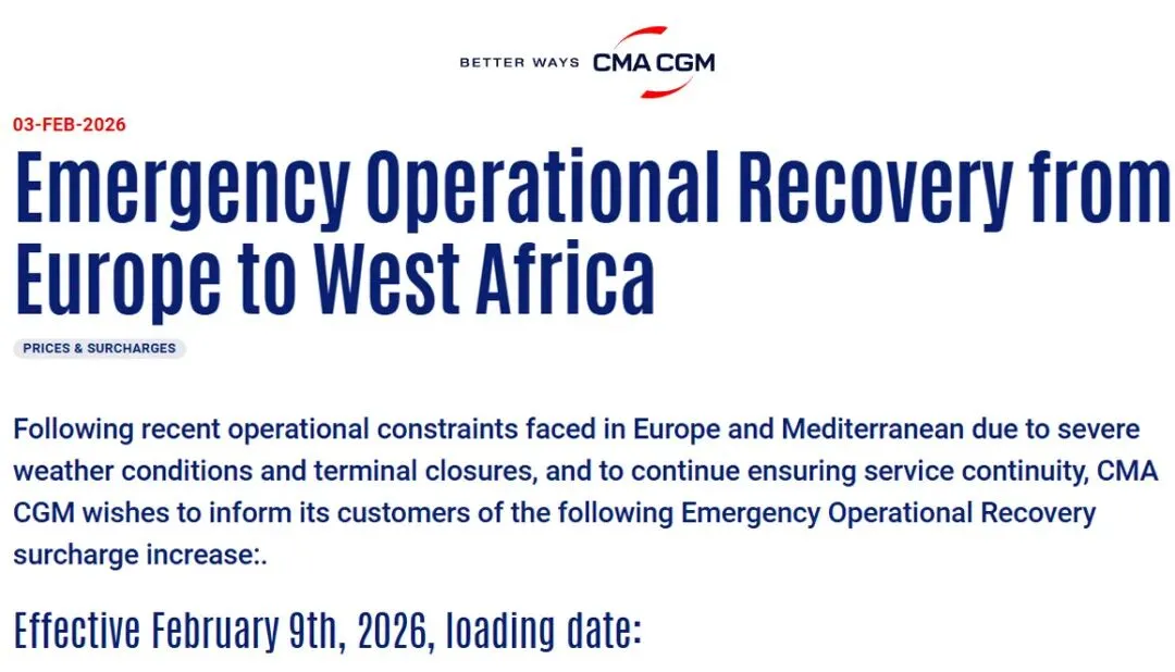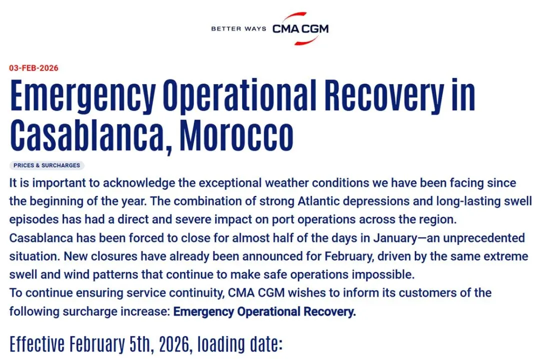 2026年初的国际航运业,正面临一场意料之外的“倒春寒”。为了维持服务连续性,航运巨头达飞海运已率先发布紧急增收附加费通知!
