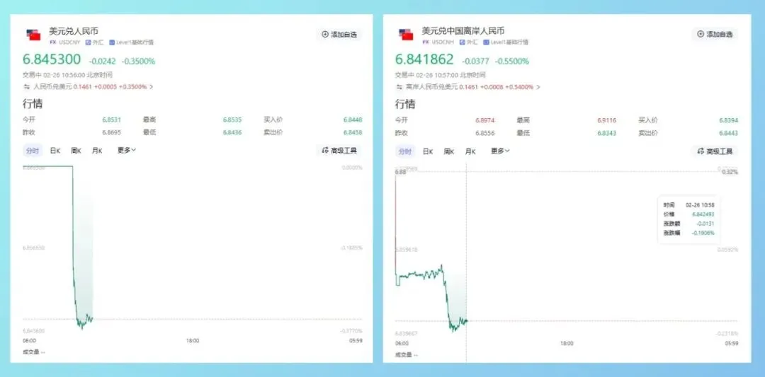 此前一个交易日(2月25日),离岸人民币盘中一度升至6.8619,在岸人民币最高触及6.8654,较前期低点明显回升,两大核心指标均刷新近两年来新高。数据显示,2月以来人民币兑美元中间价累计升值接近300个基点,阶段性升值幅度较为显著。