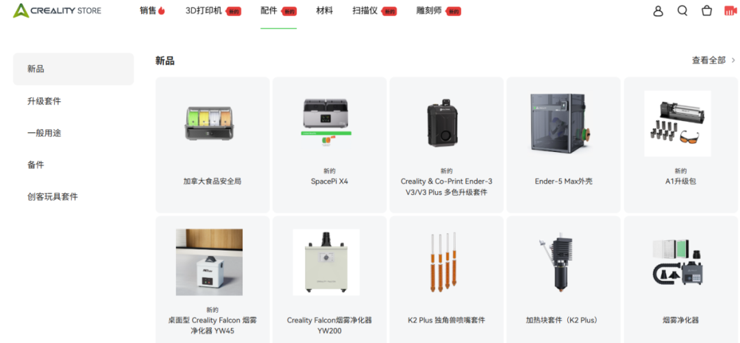 Creality深知大型工具并不会带来消耗,按照材质、型号等同步售卖每款3D打印机材料,考虑到产品外壳及小零件损耗情况,同时在官网上出售相关配件,满足用户使用需求。