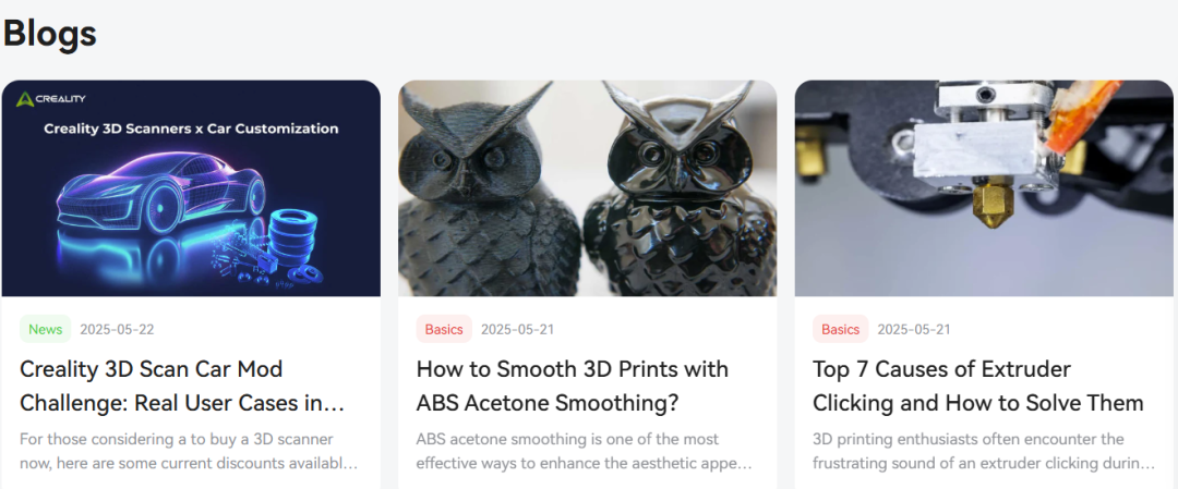 Creality认为好的3D打印机是基础,让用户“玩明白”3D打印的精髓才是真正的目的。为此,Creality定期更新博客文章,展示产品信息、3D打印技术科普、发布操作教程、应用案例分享等。