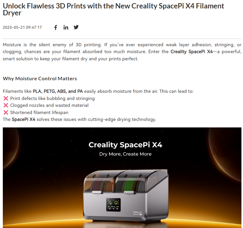 Creality针对实操时会遇见的问题撰写成博客科普文章,以问题引出最新上线的3D打印机的操作详情、注意事项和产品特点,以图文结合的形式,帮助用户更全面清晰的了解该产品的情况,吸引潜在用户购买,提高产品销量,促进独立站转化。
