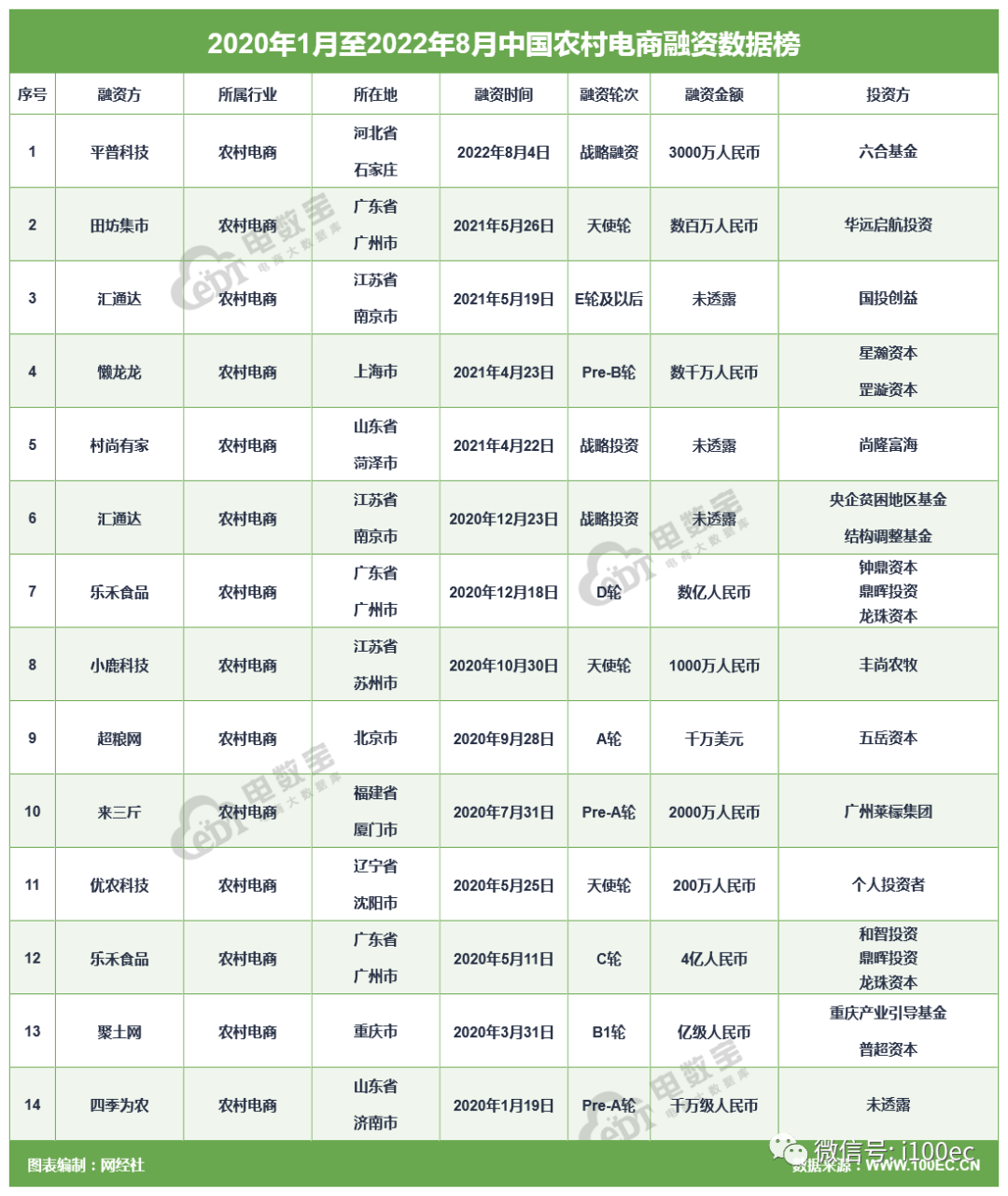 据“电数宝”电商大数据库(DATA.100EC.CN)显示,2020年1月至2022年8月,国内农村电商领域共发生了14起投融资事件,融资总额超8.6亿元。涉及的公司包括:平普科技、田坊集市、汇通达、懒龙龙、村尚有家、乐禾食品、小鹿科技、超粮网、来三斤、优农科技、乐禾食品、聚土网、四季为农等。